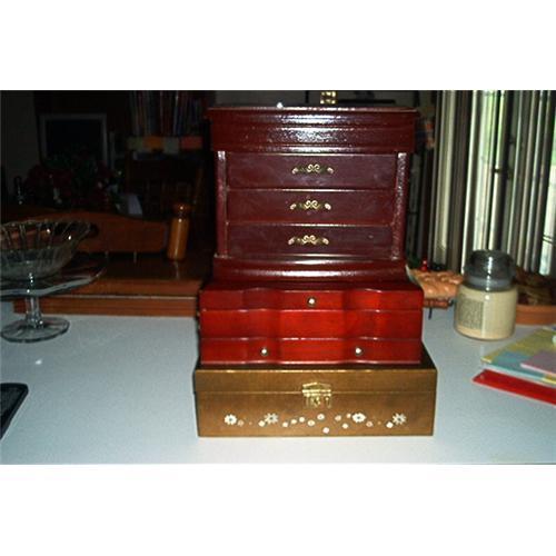 Three different jewelry boxes. One is made of cherry wood with gold toned handles and knobs. This box opens and displays a section for earrings and also goldtoned hangers for bracelets, necklaces; One bottom drawer also with separate sections.Also the top of the lid has an elastic section for jewerly. Measures 3 4/8 inches tall; 10 inches long by 7 inches wide and 3 5/8 inches tall. The second jewelry box has a lid that opens to display jewelry along with three extra drawers. Gold tone handles. Measures 8 inches tall by 9 1/4 inches long by 6 inches wide. Inside the lid displays a heart shaped mirror. Gold toned hinges.Gold colored wood. The third jewelry box is made of wood covered with gold paint and displays white flowers and stars. The inside of the lid has satin lining covered with flowers and stars, along with the large bottom area for larger pieces of jewerly. Brown velvet material lines the bottom sections. Key entry in gold tone with the back hinges also gold toned. Measurements of this box measures 11 1/4 inches long by 8 inches wide by 3 1/2 inches tall. All three jewerly boxes are in excellent condition.