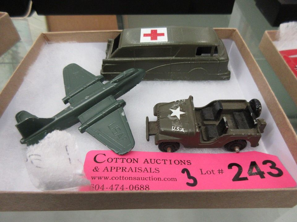 New old stock. Four inch 1950s US Army ambulance, 3/5" vintage USAF fighter jet and 2.5" vintage US Army Willys Jeep
