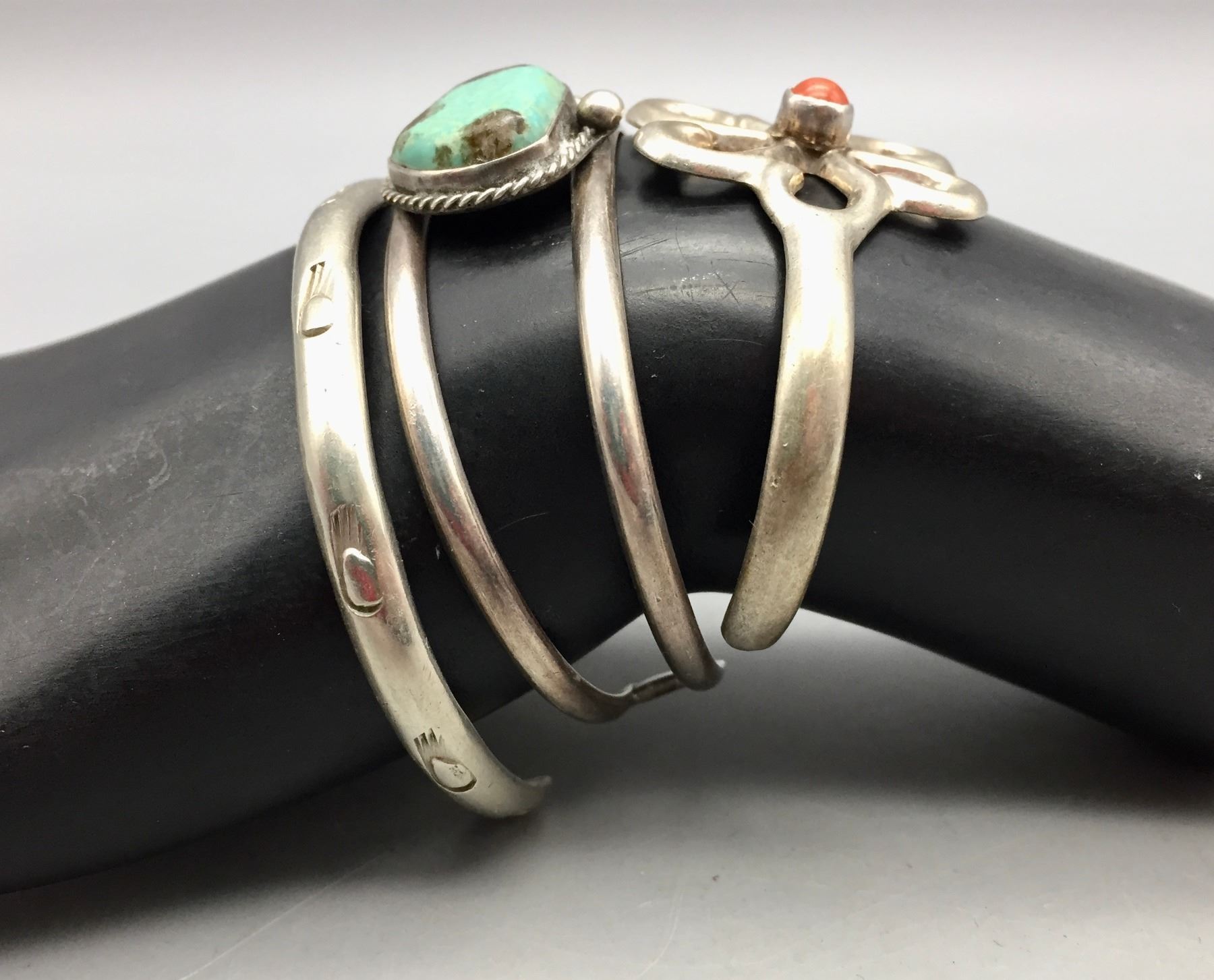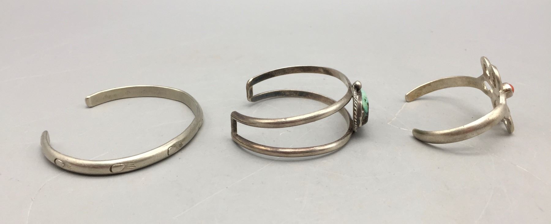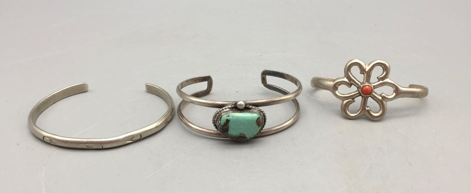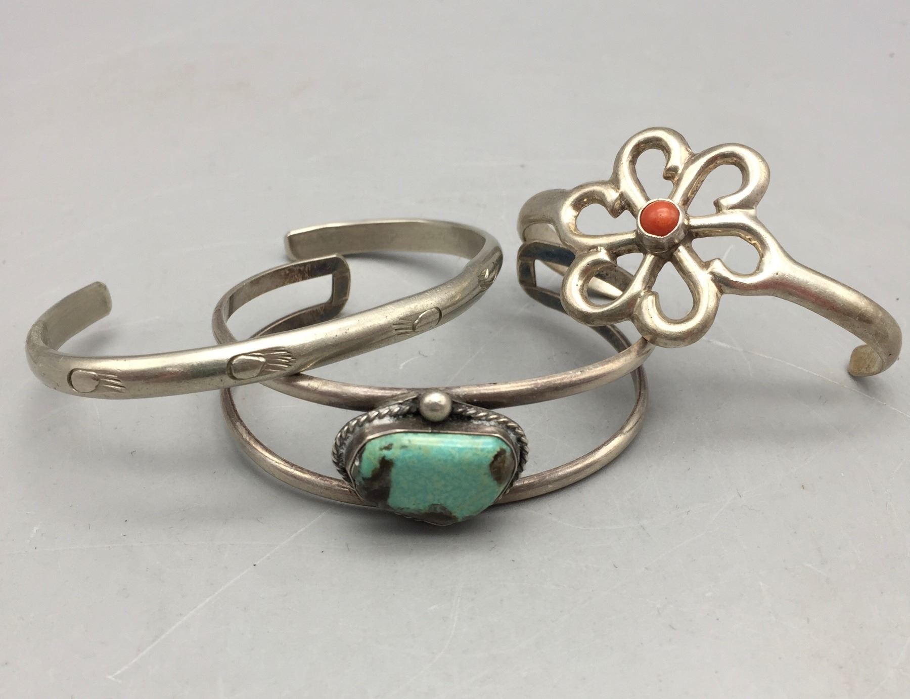 Description: For your consideration in this lot is a various sterling silver bracelets. One bracelet is set with coral. Another with turquoise. All are sterling silver. Maker: Various. Approx. Age: Vintage. Size: Various. Weighs 42.7 grams Condition: Good for their age, normal wear expected. Please look closely at the pictures - they are an important part of our description. Shipping: There will be a $5 handling / packaging fee for shipping this lot. The actual cost of postage will be added on top of that.