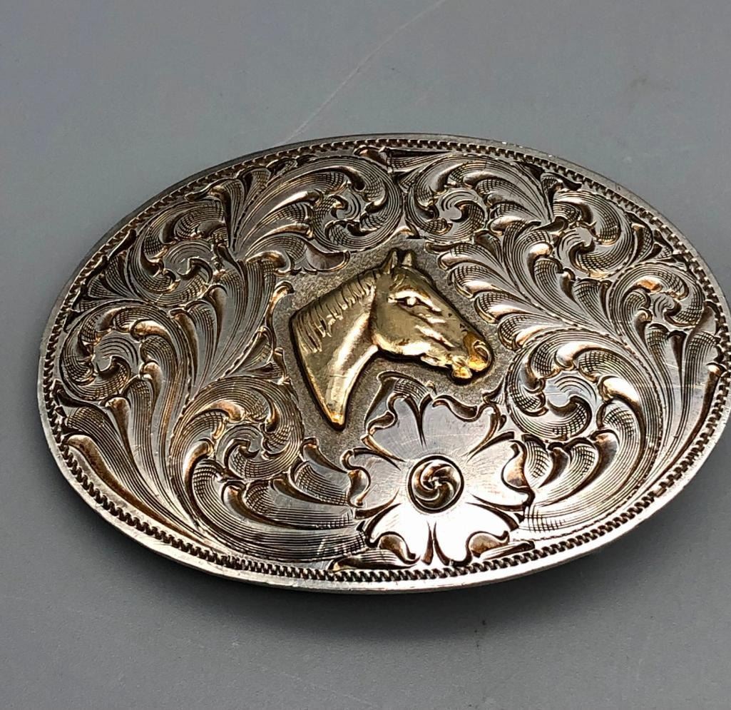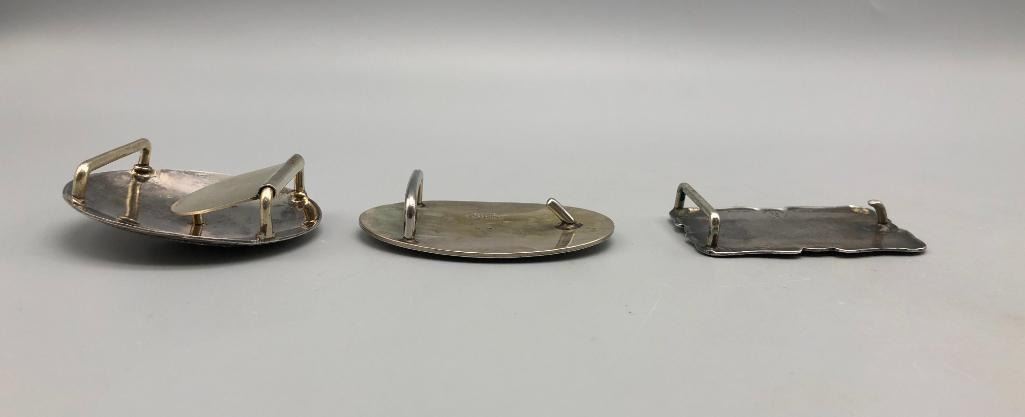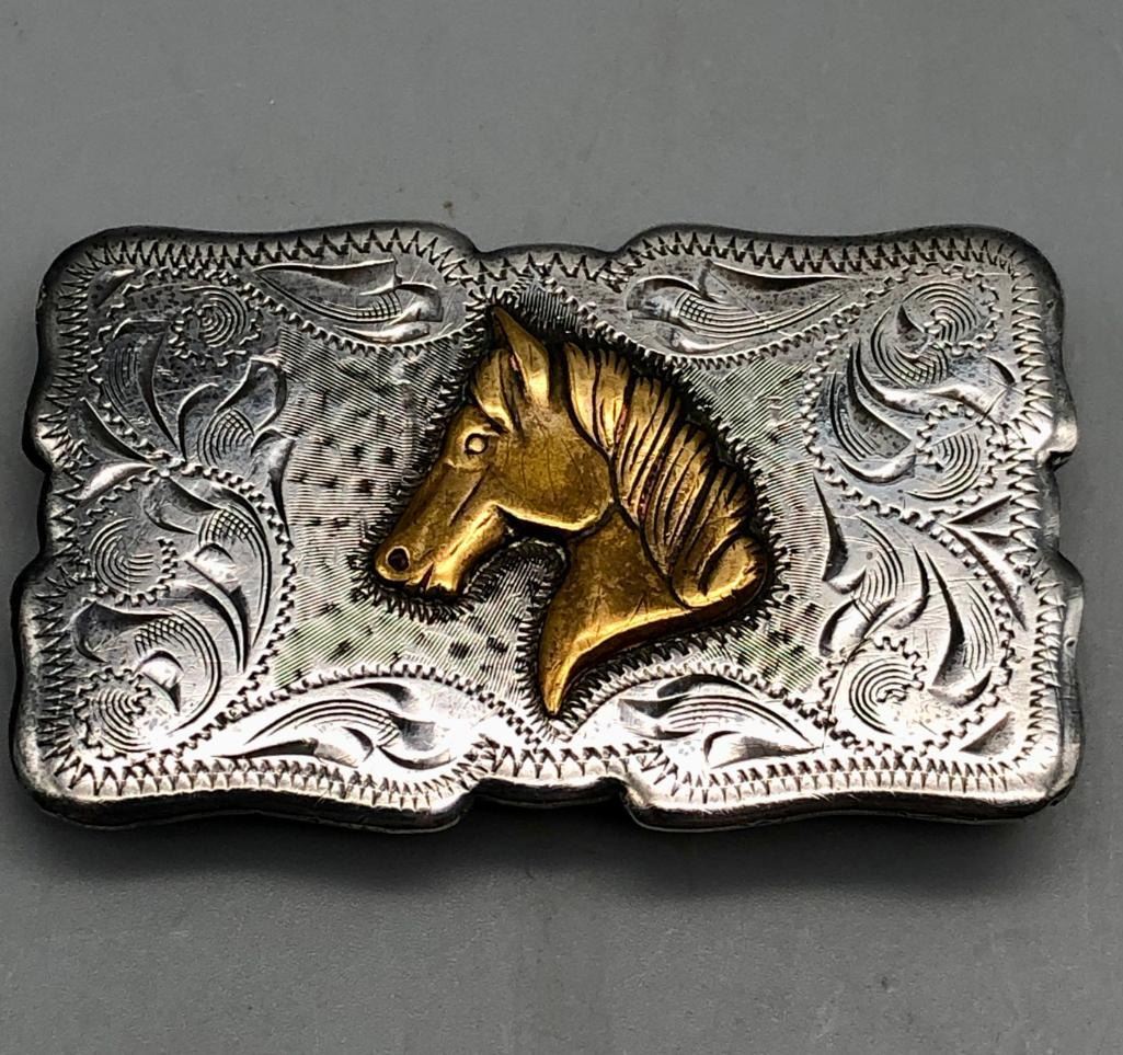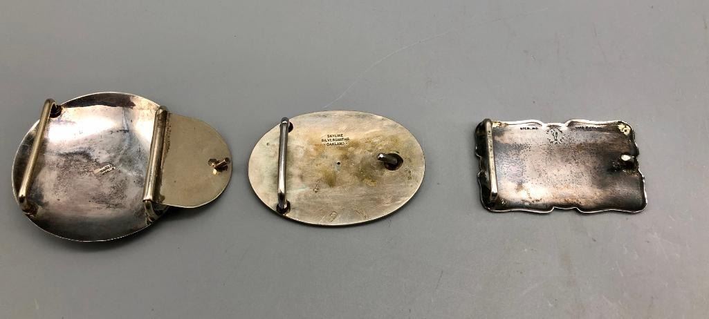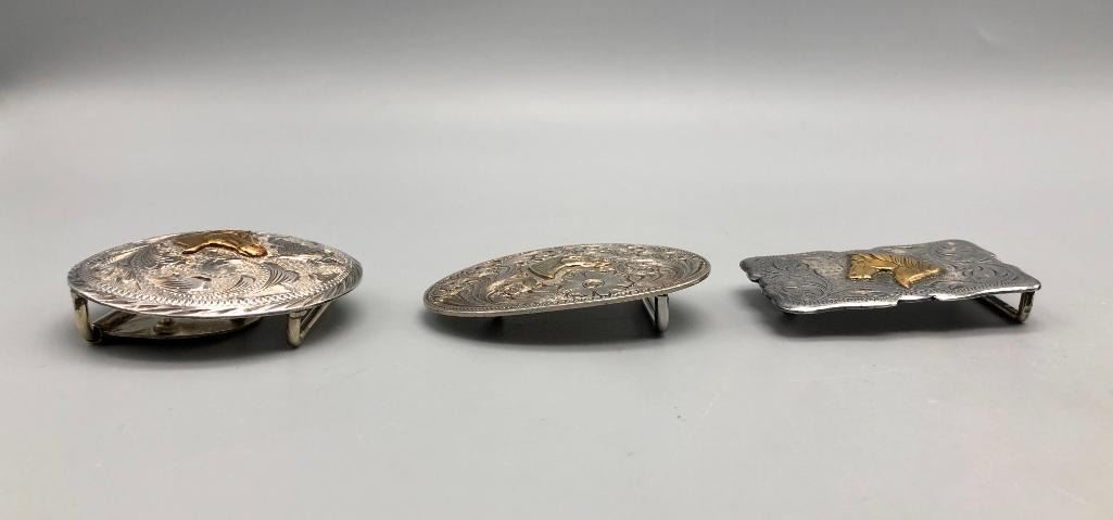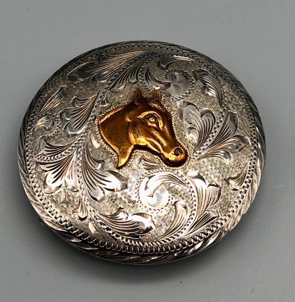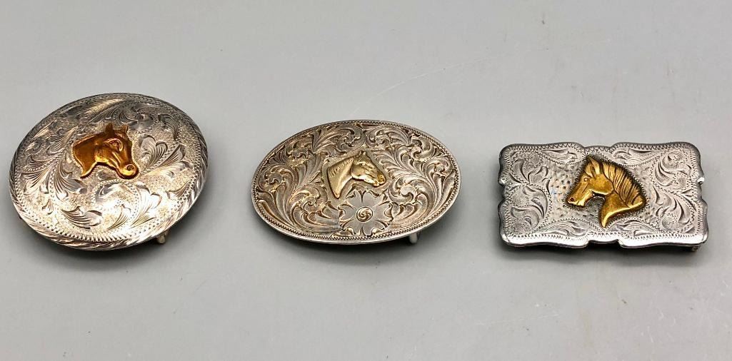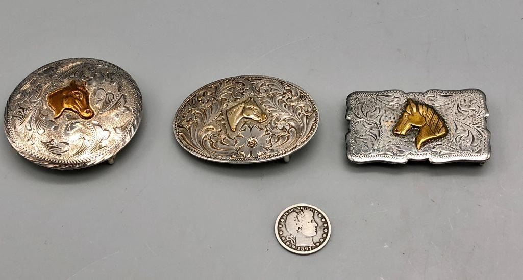 For your consideration we have three vintage sterling silver and sterling silver overlay buckles. All three buckles have silver engraved backgrounds with brass horse head profiles. Each buckle has its own unique style and size. All are stamped as sterling. MAKER: Various. APPROX AGE: Vintage. SIZE: Various sizes. Combined weight is 107.3 grams. CONDITION: Good for their age, normal wear expected. Please look closely at the pictures as they are an important part of our description and are hereby incorporated into the description, specifically with regards to condition. SHIPPING: There will be a $5 handling / packaging fee for shipping this lot. The actual cost of postage will be added on top of that. BUY IT NOW: If you would like to buy this item now, without waiting for the auction day to bid on it, we do offer this option (which is available up to 48 hours before the actual auction starts). The “Buy it Now†price is the high estimate of this lot (plus applicable fees and the Buyer's premium is discounted to 10% when using the Buy it Now option). If you would like to exercise this option, you must contact us by email (or phone as long as you talk to someone live). Reference this lot number and your intention to "Buy it Now."