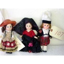 These three dolls are made of durable plastic. The 1972 Vogue dolls are approximately 7 inches. They have moveable head, arms, legs and eyes. One is dressed in a western outfit. A long green skirt with a red floral stripe, black vest and western hat over her long brown hair. She is in good condition. The second Vogue doll is in a Scottish outfit. A red plaid skirt, white shirt with lace collar, black jacket and tall white "fur" hat covering her long blond hair. She is in good condition. The third Vogue doll of this lot is dressed as a signorita. She is wearing a long black ruffled skirt and red top with a lace veil covering her brown hair. She is in good condition.