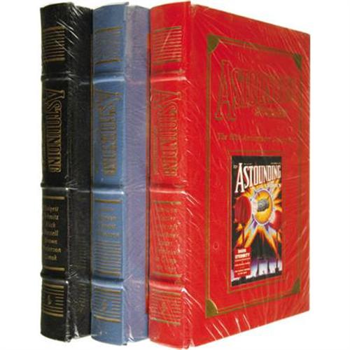 <B>Three Volume Set of <I>Astounding Stories: The 60th Anniversary Collection</B></I></B></I> <B>Edited by James Gunn</B></I> (Norwalk, Connecticut: Easton Press, 1990), limited first editions, various paginations, all volumes in full leather: volume 1: red, volume 2: blue, volume 3: black, 8vo (6.25" x 9"), no dust jackets (as issued). These fascinating volumes reprint classic science fiction stories that first appeared in <I>Astounding Stories,</B></I> now <I>Analog</B></I> magazine. The authors reprinted in this collection are second to none in the pantheon of weird fiction and include Murray Leinster, H. P. Lovecraft, Don A. Stuart (John W. Campbell, Jr.), Robert Heinlein, L. Sprague de Camp, A. E. van Vogt, Isaac Asimov, Theodore Sturgeon, Hal Clement, Jack Williamson, James Blish, Poul Anderson, and Clifford Simak, among others. The books are as new, and still in the factory shrink-wrap.<BR><BR><b>Shipping:</b> Books & Catalogs (<a target="_blank" href="http://www.heritageauctions.com/common/shipping.php">view shipping information</a>)