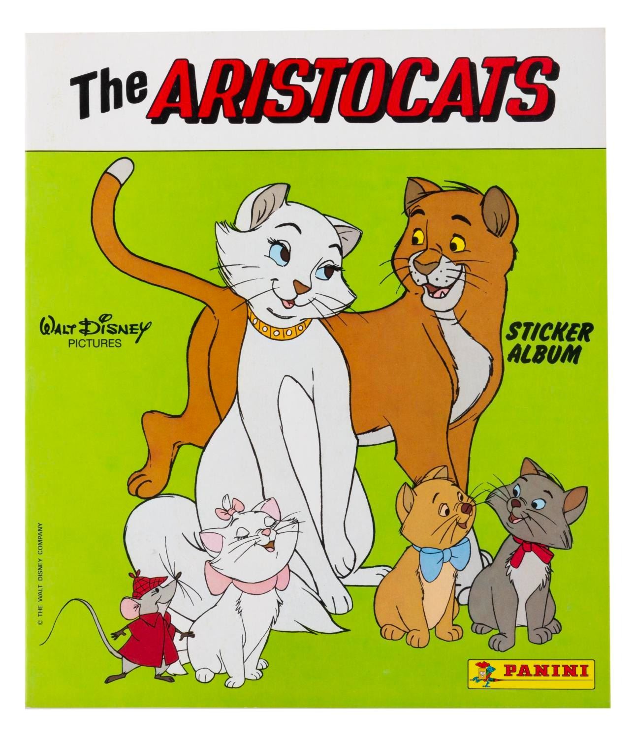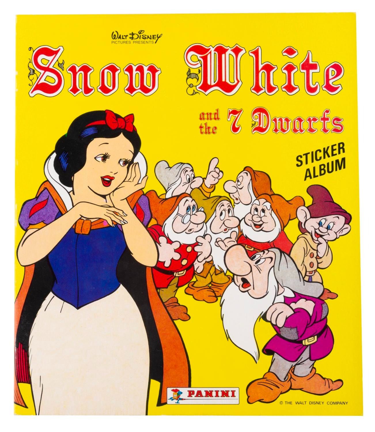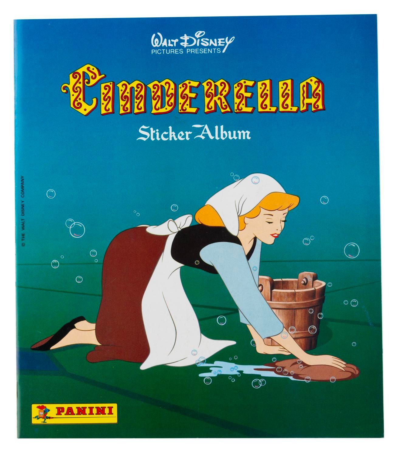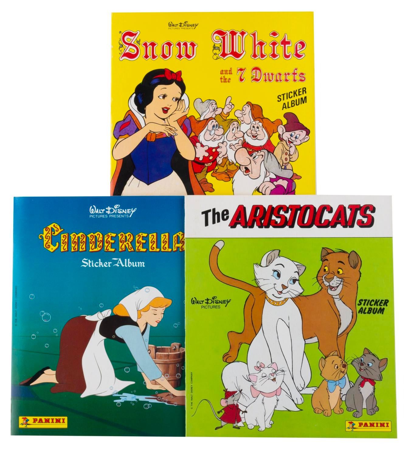 (Panini, 1970s-80s) Three Panini collectible sticker albums, including "Snow White and the 7 Dwarfs," "Cinderella," and "The Aristocats." The "Cinderella" book is filled with stickers, and the other two are unused and do not include stickers. Measuring 9" x 10.5" each, the books are in fine-as-new condition, with the "Cinderella" book in very good condition.