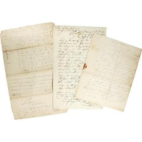 <B>Three War of 1812 Era Documents and Letter.</B></I> An interesting lot including a one page letter from James Fisk, 7.75” x 10”, Washington, March 10, 1814, to Oliver Ingham in which he writes in part: “<I>The prospects of peace in Europe have vanished, & the war continues as fierce & sanguinary as ever, and I think that you may calculate on an active campaign in this country the ensuing summer…</B></I>”, toned with the usual creases, very good; a one page, 8.25” x 13.5”, receipt for supplies provided to army troops under the command of 2nd Lt. John Stump of the F. B. Hussars, dated September 23, 1814, listing all items furnished and the annotation “<I>I certify that the items in the above bill have been furnished by Wm. Ross of Bladensburg to bidettes under my command in the serving of the U. States…</B></I>”, toned, with fold creases and old tape repairs on the verso, else good condition; and a one page, 7.5” x 12” deposition dated September 7, 1815, Niagara County, New York, concerning an inquiry into the matter of “<I>unfit beef</B></I>” for troops and the disposal thereof, toned, with the usual folds, else very good. <I>Ex. Henry E. Luhrs Collection.</B></I> <BR><BR><b>Shipping:</b> Flat Material, Small (<a target="_blank" href="http://www.heritageauctions.com/common/shipping.php">view shipping information</a>)