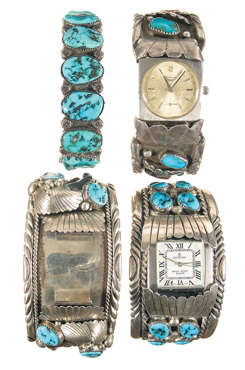 3 silver watch bracelets with pieces of turquoise (one is missing the watch), silver bracelet with 10 pieces of turquoise. Very fine.
