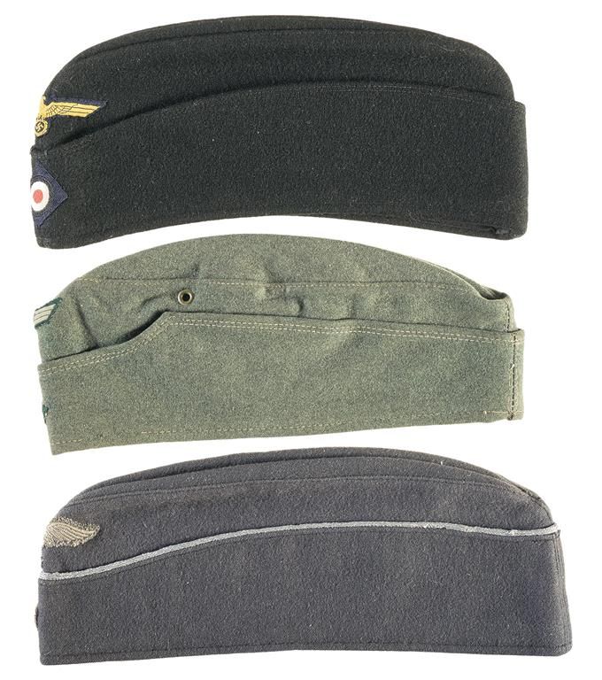 1) Kriegsmarine field cap, black wool construction with blue fabric backed Nazi eagle and cockade patches, and a black fabric lining marked in white "57/Heinrich Belks/Mutzenfabrik/BREMEN/1941" 2) Heer field cap, feldgrau construction with green fabric backed patched, white stitching, olive colored vent grommets and an unmarked tan cloth inner lining. 3) Luftwaffe officer's field cap, grey felt construction with grey cloth backed embroidered eagle, embroidered cockade, silver piping, and an unmarked grey cloth inner lining.