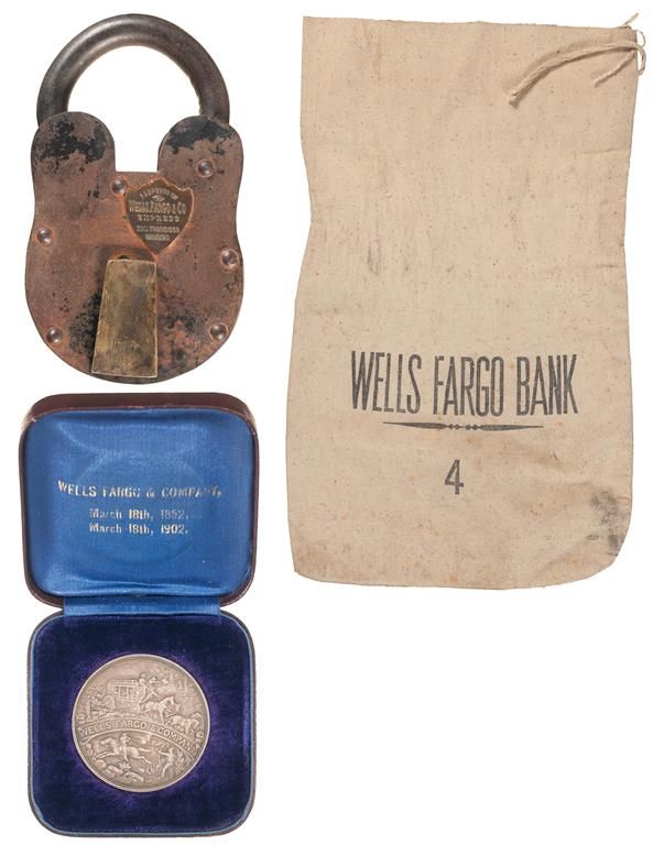 1) Large metal padlock, 5 1/8 inches wide, 9 inches tall, with a swiveling brass keyhole cover and a stamped brass shield reading "PROPERTY OF//WELLS,FARGO & CO./EXPRESS/SAN FRANCISCO/DIVISION" on the front. 2) White canvas bag, 19 1/2 inches long and 11 1/2 inches wide, with black stamp "WELLS FARGO BANK/4" on one side. 3) Wells Fargo semi-centennial commemorative silver coin, 1 1/2 inches across with excellent detail. With a brown leatherette case.
