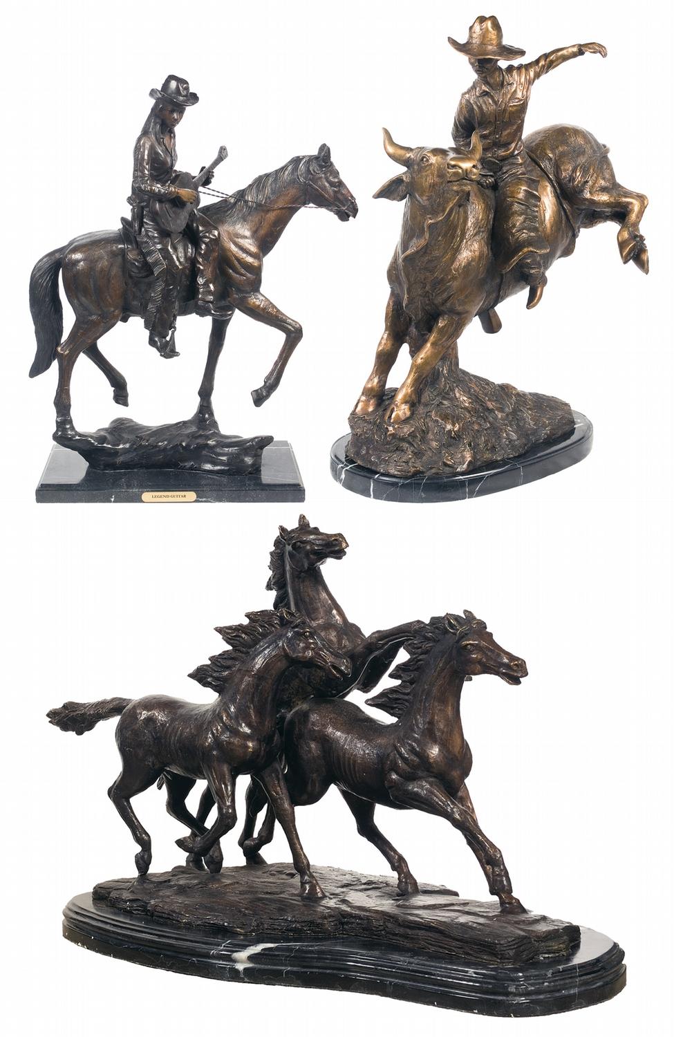 1) Dwayne Scott (Am 20th C Fl) signed bronze of a singing cowboy riding a horse. This large bronze depicts the classic Hollywood movie image of a cowboy attired in clean western attire riding upon a horse through the prairie that is set, on a rectangular black marble plinth. Overall dimensions are approximately 24"x18"x8". 2) Robert Farthington Elwell (Am 1874-1962) signed bronze sculpture of a bull rider. The bronze shows a cowboy in rodeo attire astride a bucking bull, with an outstretched arm to maintain balance. Measuring 24"x22"x12". 3) Robert Farthington Elwell (Am 1874-1962) signed bronze sculpture of three galloping horses racing across the prairie. Mounted on a large, contoured oval marble base. Measuring 18"x28".