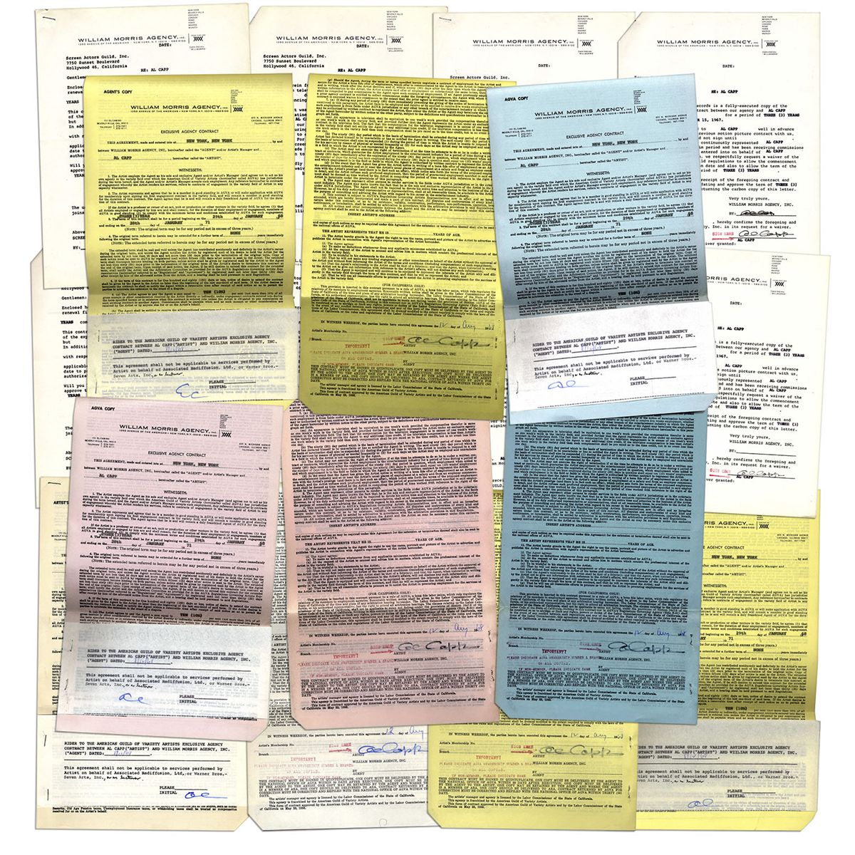 Al Capp three contracts signed with 18 signatures in total. Contracts between Capp and William Morris Agency date to circa 1968. The first William Morris Agency three-year contract is dated 29 January 1968. Standard contract lists Capp's various agents with the terms denoting 10% of earnings to said agents. Ten signatures to first contract in total: Signed ''AC'' in blue ink on a slip stapled to page 1; ''Al Capp'' in black ink to page 2, ''AC'' in blue ink on a slip stapled to page 2, ''Al Capp'' in blac to page 4, and again identically to pages 5, 6, and 7. With two additional contracts each signed four times by Capp in black ink. With 18 sheets in total. Toning and creasing, else near fine.