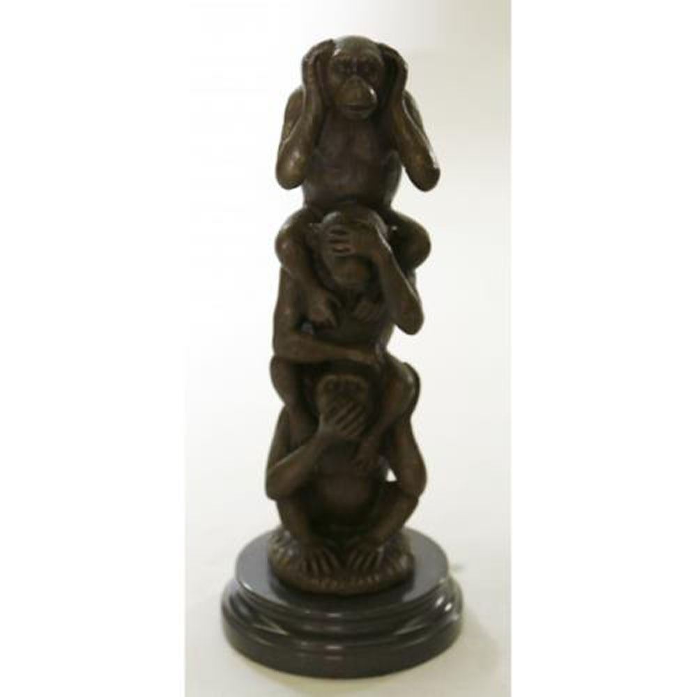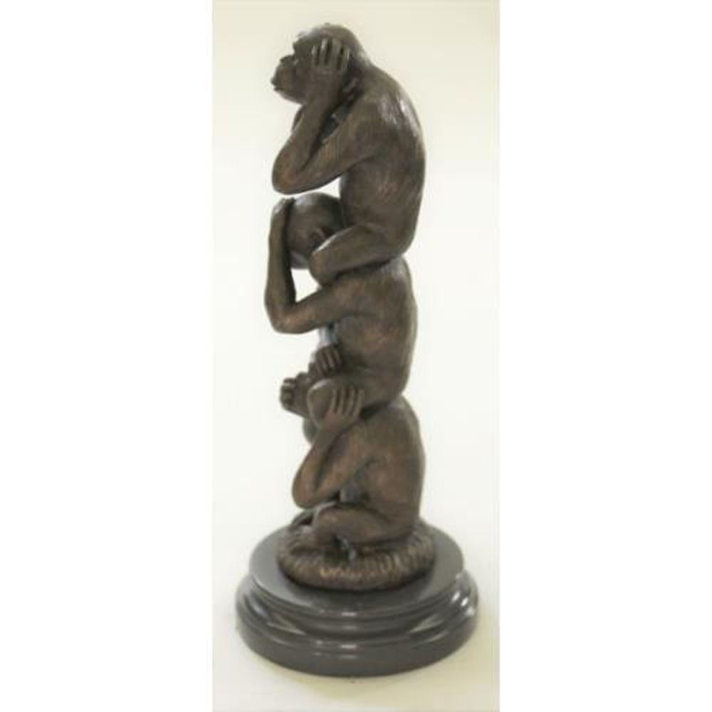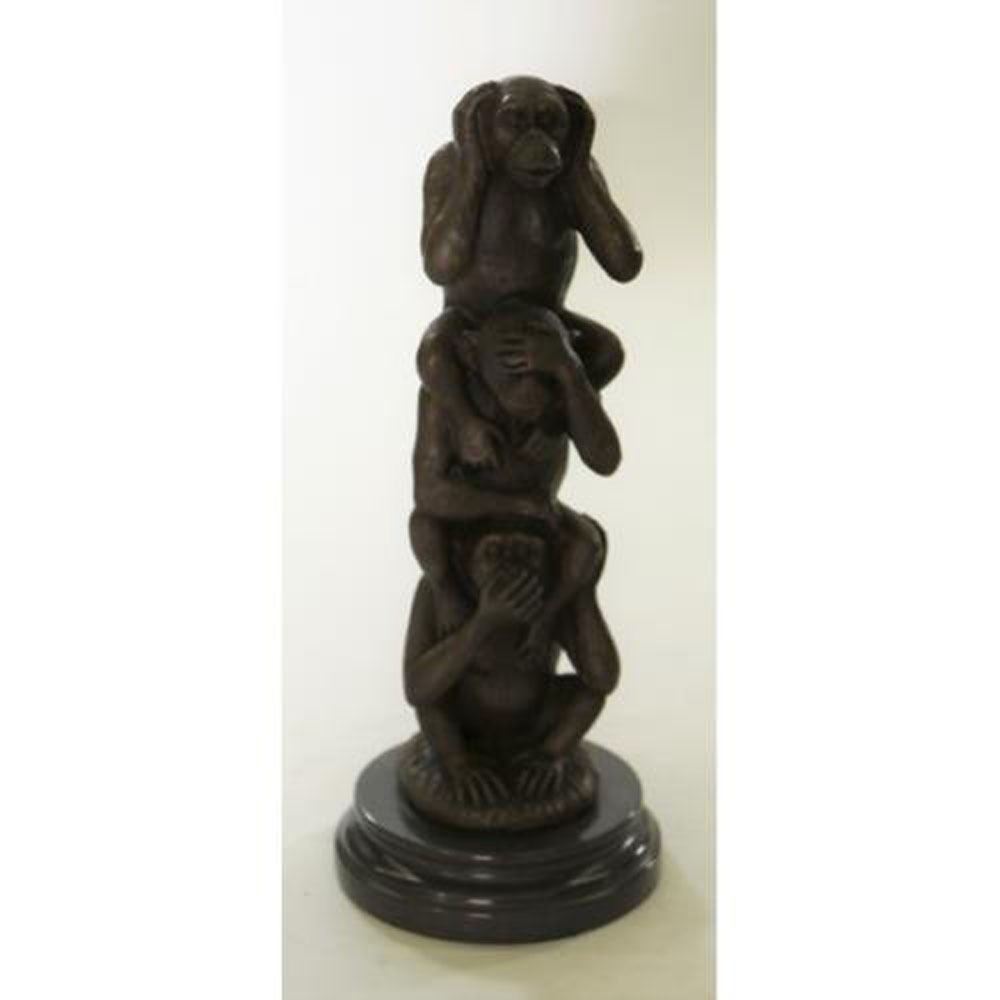 Based On The Three Wise Monkeys Sculpture Found On The Door To The Sacred Shrine Of Tosho Gu In Nikko, Japan. This Sculptures Of The See No Evil, Hear No Evil And Speak No Evil Monkeys Add A Wise Statement To The And Garden, The Impressions Left Behind The Theme Has Since Grown To Include Many Other Animal Statues Including Cherub Statues. This sculpture was cast using the Lost Wax Method and mounted on a marble base. Bronze Dimensions with Marble Base: Height 16 X Width 6 Inches. Weight: 12 LBS.