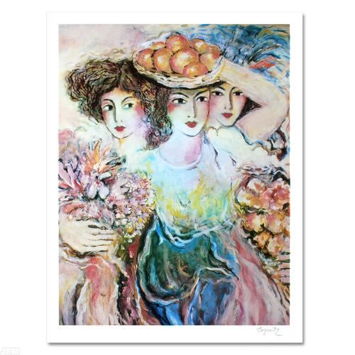 With soft, sweeping brush strokes and a delicate color palette, Zamy Steynovitz (1951-2000) created sweet, romantic artwork. "Three Women" is a limited edition offset lithograph on paper, numbered and hand signed by Steynovitz. This piece was acquired in a gallery close-out and there is no specific certificate information available. Measures approx. 22" x 29" (with border), 19.5" x 25" (image).