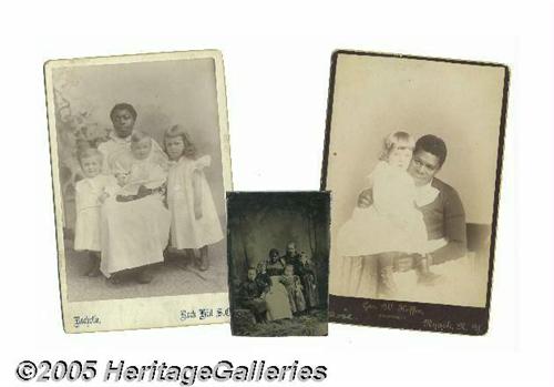 <B>Three Wonderful Photos of White Children with Their Black Nannies</B></I> The first, a cabinet card, features a smiling nanny with a somewhat nervous child taking comfort from mammy's cheek, photographer's imprint on the card below. The second, also a cabinet card, shows a nanny with her three charges, by Rochelle of Rock Hill, South Carolina. The last, a sixth plate tintype, shows a sitting nanny with five children around her, the youngest is the only boy. Three touching items that articulate how some African American domestics were truly considered "part of the family." Lot:250
