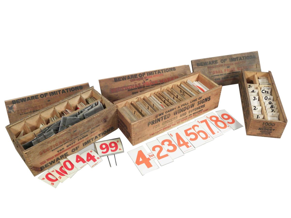 Lot of Three Wood Boxes of Grocery Store Shelf Tags. Sectional Price Marking, The Hopp Press Inc. NY. Patented 1921. Various size boxes and tags. All in very good condition.