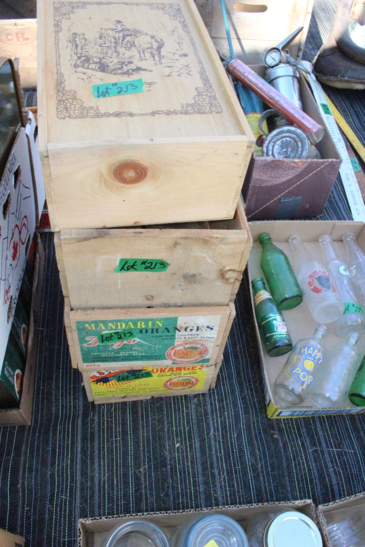 Three Wooden Mandarin Orange Boxes & 1 Wooden Wine Box