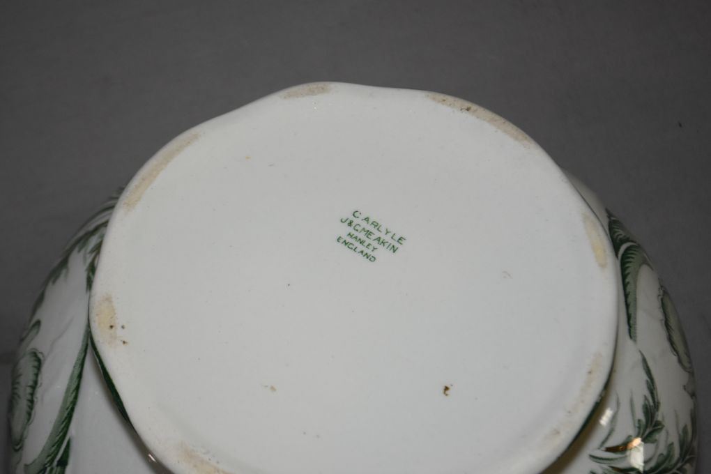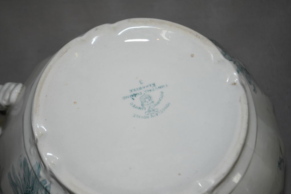 Three antique chamber pots including a lidded Porcelain Royale, and two unlidded including J.N.C. Meakin and one unmarked, all with transfer ware floral design in hues of green and blue