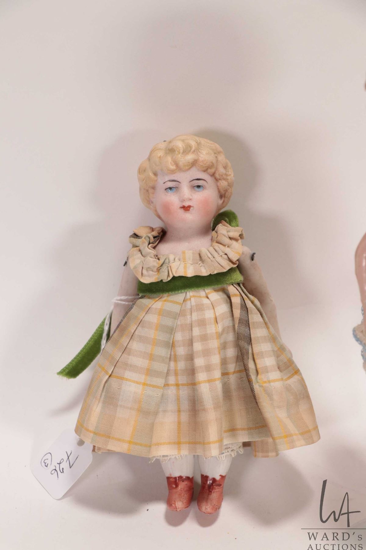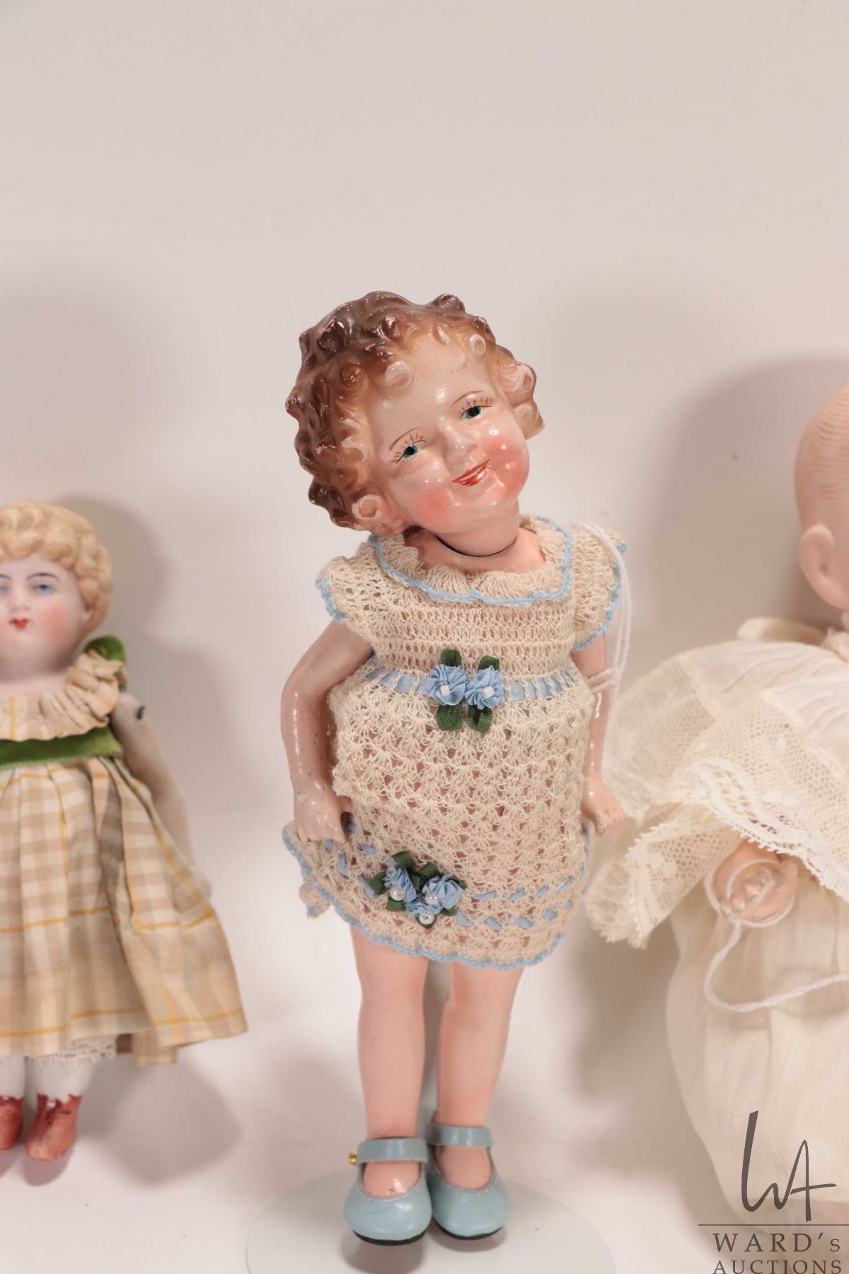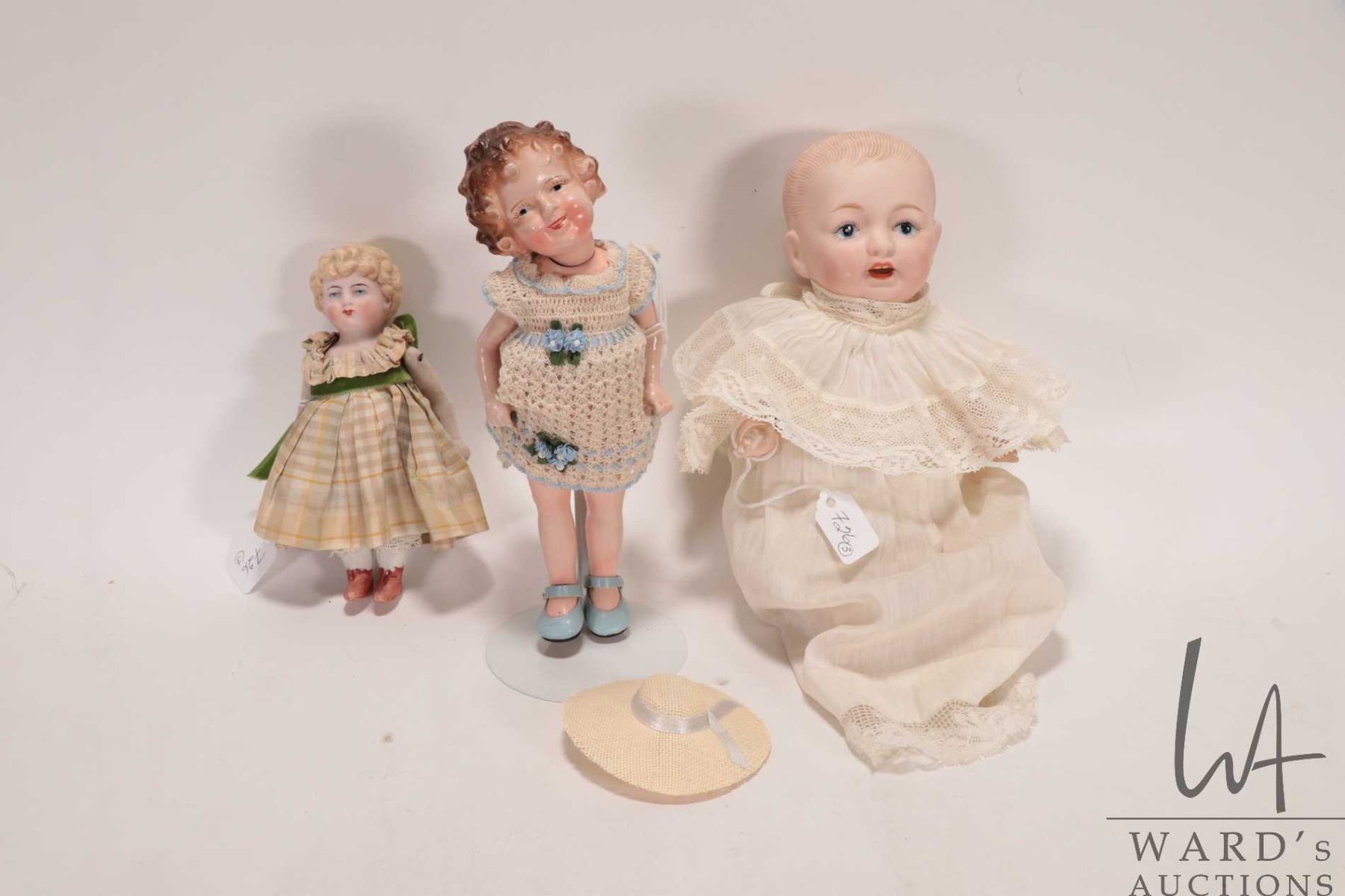 Three antique dolls including Nippon bisque head baby doll on composition body 8 1/2" , a 7 1/2" Japanese composition doll in hand knit dress 7 1/2" and an 5 1/2" all bisque doll.
