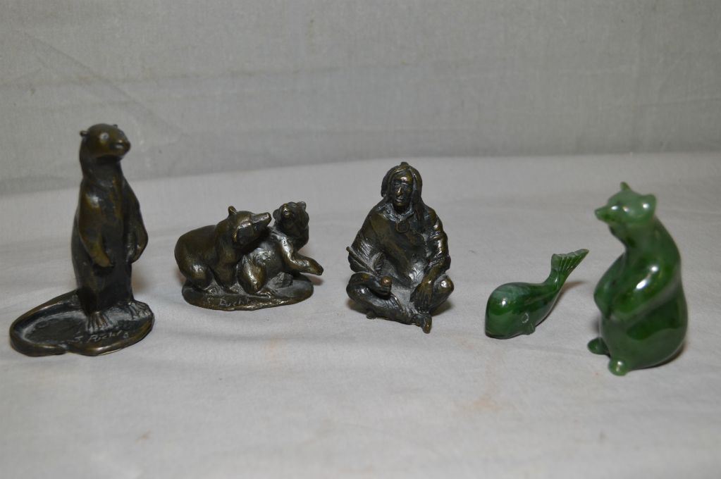 Three artist signed bronze miniatures including a 3 1/2" high otter, playful bears and an Indian Brave by artist S. Puchta plus two jade carvings, a bear and a whale