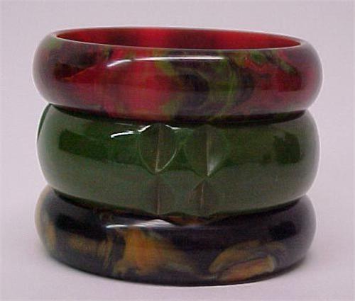 Three bakelite bangles including one medium green with carving; 7/8" wide; one 5/8" wide red with green marbling; and one 5/8" wide yellow with black and multi-colored marbling; no noticeable defects Estimate 160/250 "