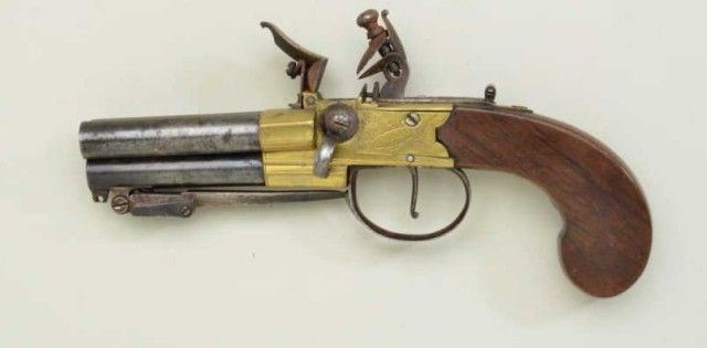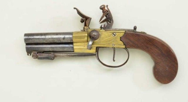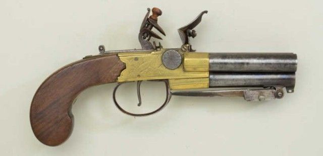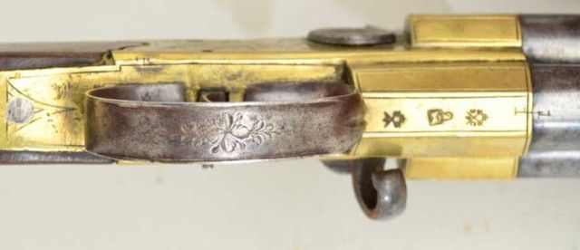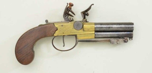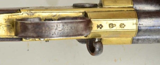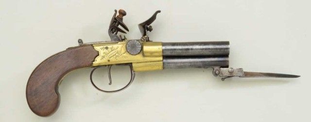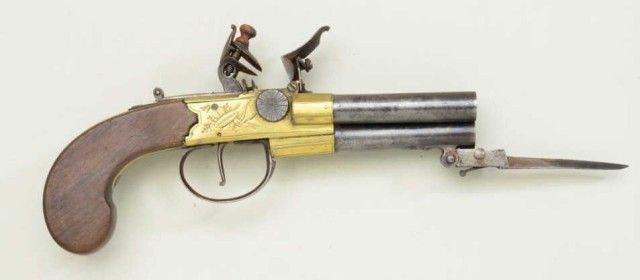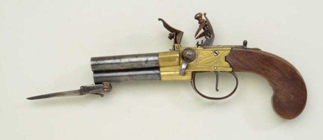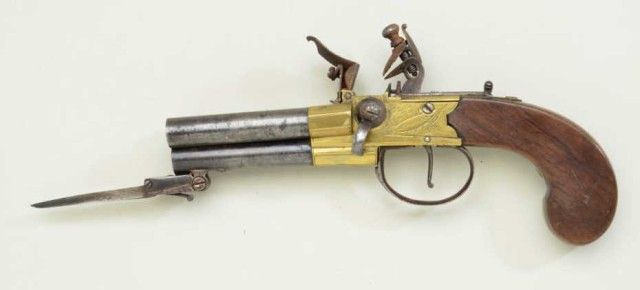 Three barrel tap-action Flintlock pistol with brass body signed “J.N. Jones London” in very good original condition with under mounted spring bayonet. The pistol measures 8-3/4” overall with 2-3/4” barrel group ofapprox 38 cal false rifled. The barrels show 30-50% blue drifting to brown with some spotting and pitting just starting. The brass frame shows sharp engraving and light cleaning long ago now aging back nicely. The grips are very good with some minor marks, normal age. The steel parts show some light new rust and minor pitting and would clean. The bayonet springs quickly and locks properly. Last sold Richard K. Bournecatalogue of James Elwood Jones collection 1981. From an old New York collector’s estate. Est.; $1,500-$3,000.