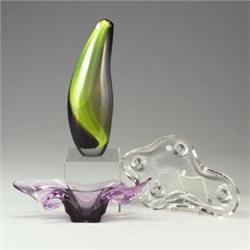 Three biomorphically-shaped glass pieces: a tall vessel with small opening in black and chartreuse; a clear four-place candleholder; and a bowl in blue and charcoal. A couple of minor nicks. Unmarked. 15 3/4" h, 14 1/2" and 15 1/2" dia. $200 - 300