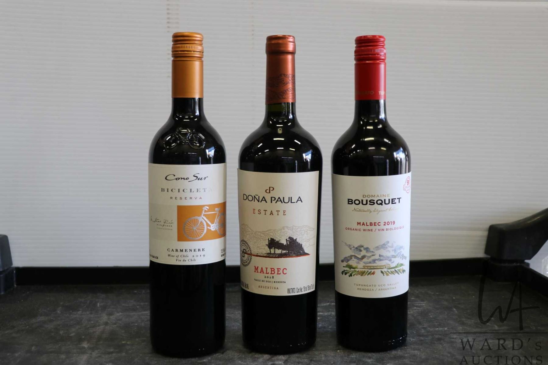 Three bottles of wine including Cono Sur Bicicleta Reserva Carmenere 2019 750ml / 13.5% ABV, Dona Paula Estate Malbec 2018 750ml / 14% ABV, and a Domaine Bousquet Malbec 2019 750ml / 14% ABV Note: Alcohol cannot be insured by any courier in Canada. Local pick up is recommended. Canadian bidders only