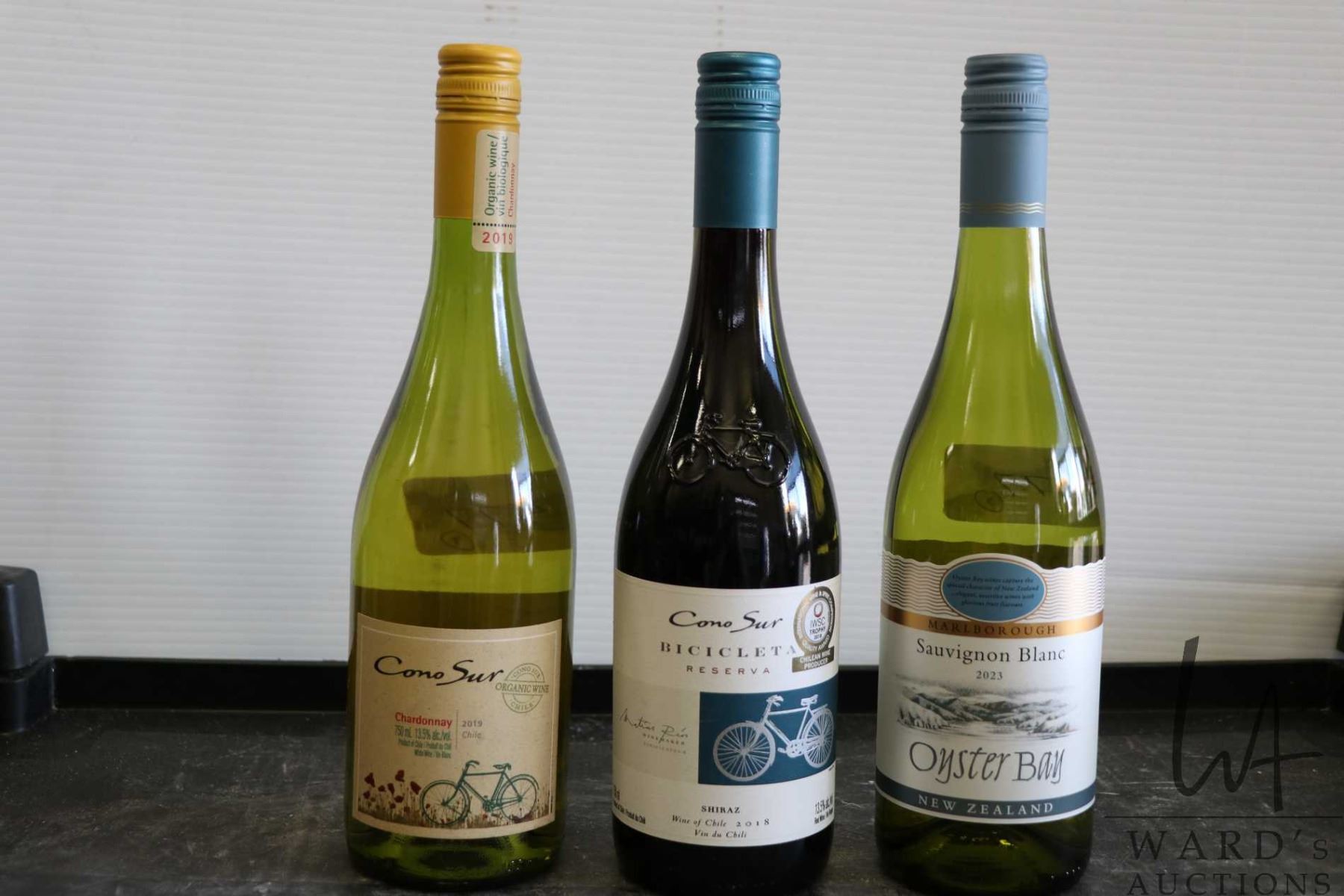 Three bottles of wine including Cono Sur Chardonnay 2019 750ml / 13.5% ABV, Cono Sur Bicicleta Reserva Shiraz 2018 750ml / 13.5% ABV, Marlborough Oyster Bay Sauvignon Blanc 2023 750ml / 14% ABV including Bicicleta Reserva Unoaked Chardonnay 2019 750ml / 13.5% ABV, Bicicleta Reserva Shiraz 2018 750ml / 13.5% ABV, and a Pinot Noir 2019 750ml / 14% ABV Note: Alcohol cannot be insured by any courier in Canada. Local pick up is recommended. Canadian bidders only