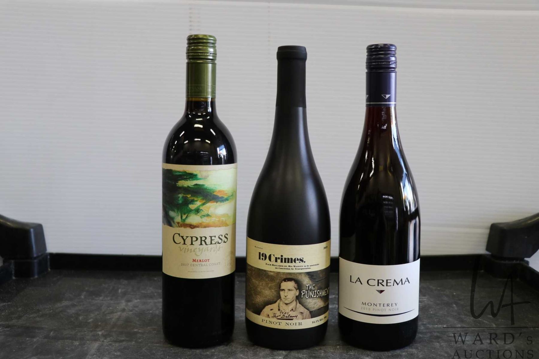 Three bottles of wine including Cypress Vineyard Merlot 2017 750ml, 19 Crimes The Punishment Pinot Noir 750ml / 14.1% ABV, and a La Crema Monterey Pinot Noir 2018 750ml Note: Alcohol cannot be insured by any courier in Canada. Local pick up is recommended. Canadian bidders only
