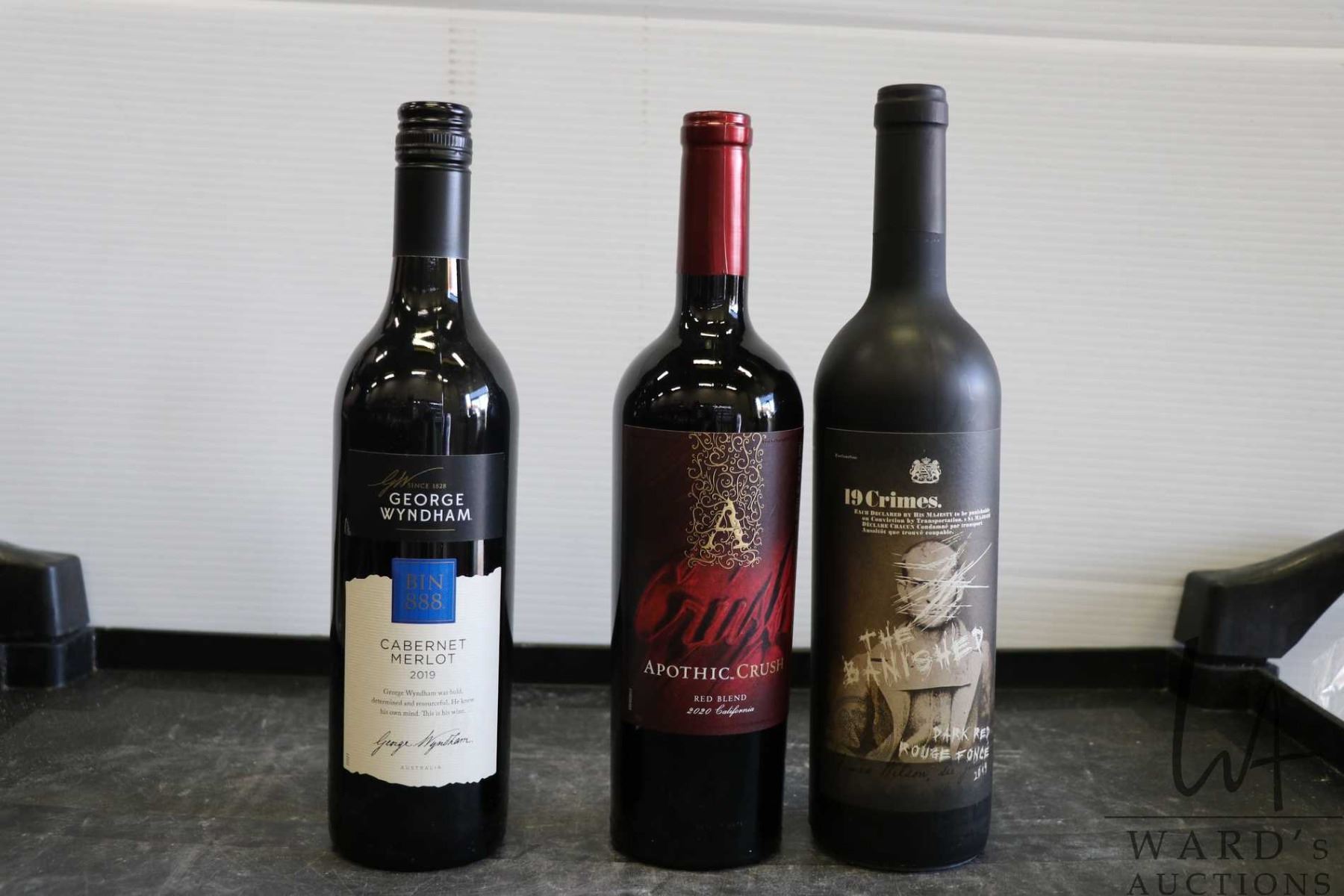 Three bottles of wine including George Wyndham Bin 888 Cabernet Merlot 2019 750ml , Apothic Crush Red Blend 2020 750ml, and a 19 Crimes The Banished Dark Red 2019 750ml Note: Alcohol cannot be insured by any courier in Canada. Local pick up is recommended. Canadian bidders only