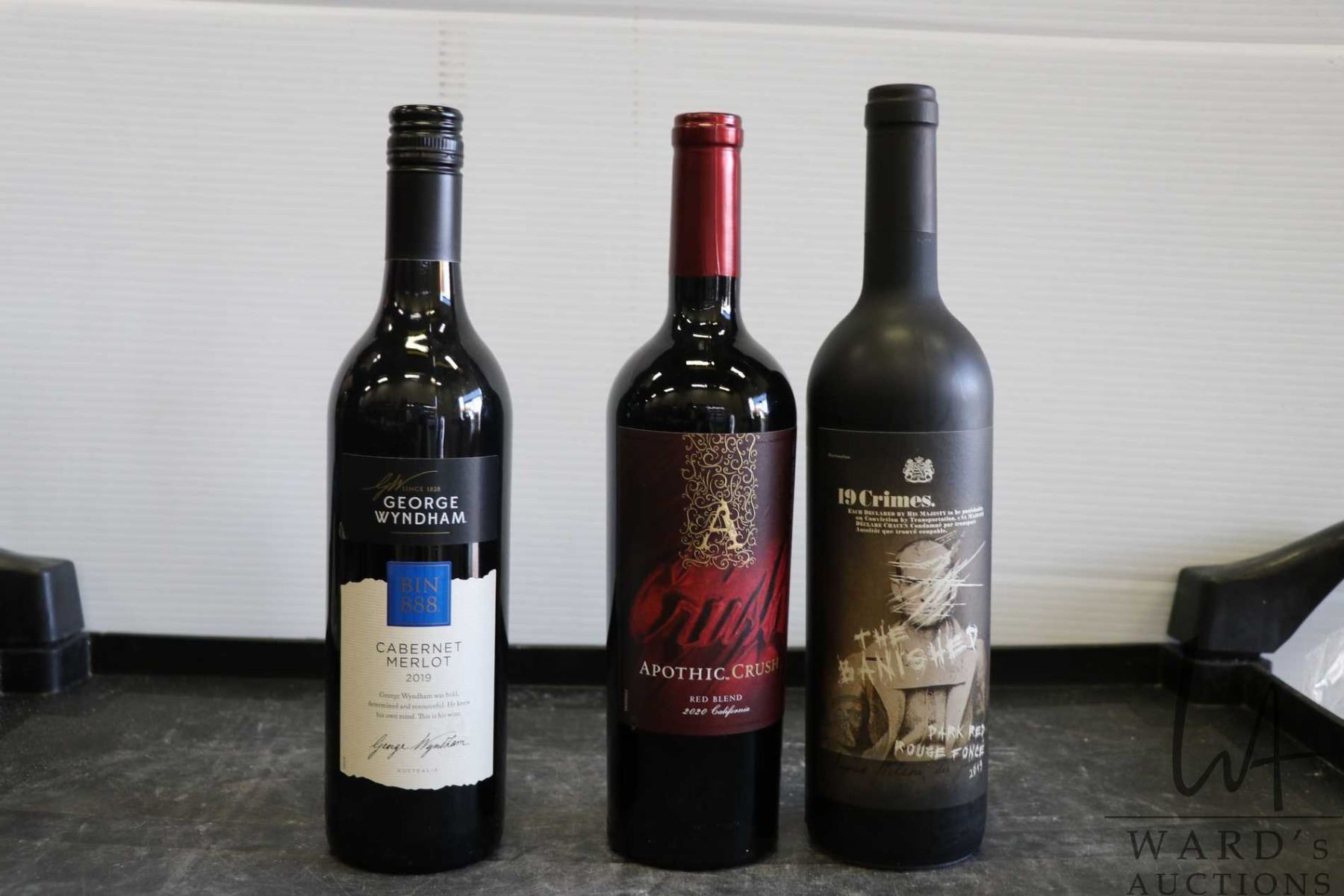 Three bottles of wine including George Wyndham Bin 888 Cabernet Merlot 2019 750ml , Apothic Crush Red Blend 2020 750ml, and a 19 Crimes The Banished Dark Red 2019 750ml Note: Alcohol cannot be insured by any courier in Canada. Local pick up is recommended. Canadian bidders only
