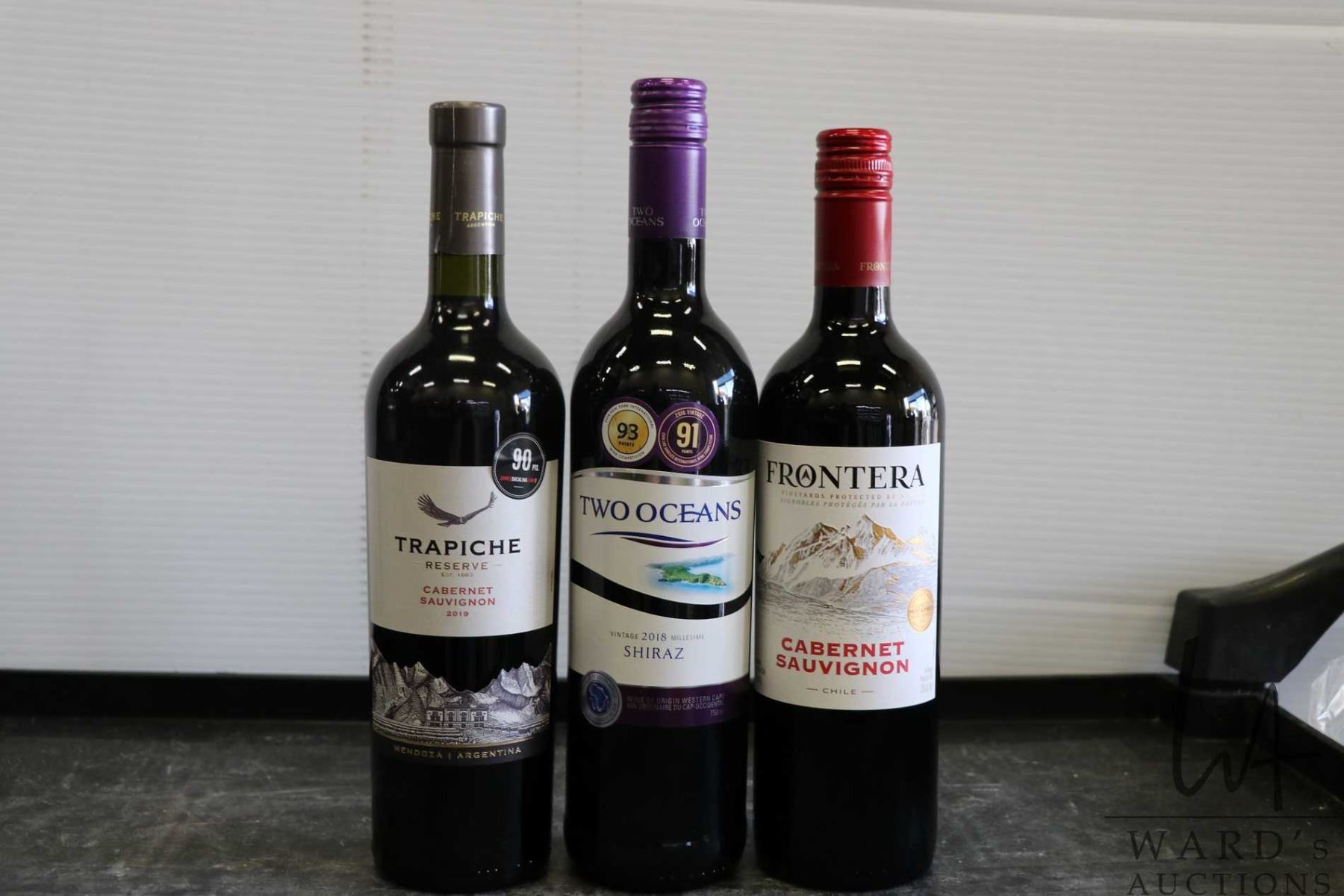 Three bottles of wine including Trapiche Reserve Cabernet Sauvignon 2019 750ml / 13.5% ABV, Two Oceans Shiraz 2018 750ml / 13.5% ABV, and a Frontera Cabernet Sauvignon 750ml / 12% ABV Note: Alcohol cannot be insured by any courier in Canada. Local pick up is recommended. Canadian bidders only