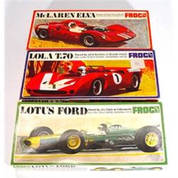Three boxed 1960s 'Frog' 1/24th scale plastic model kits of racing cars, Lola T70, Lotus Ford and McLaren Elva (complete and unmade)