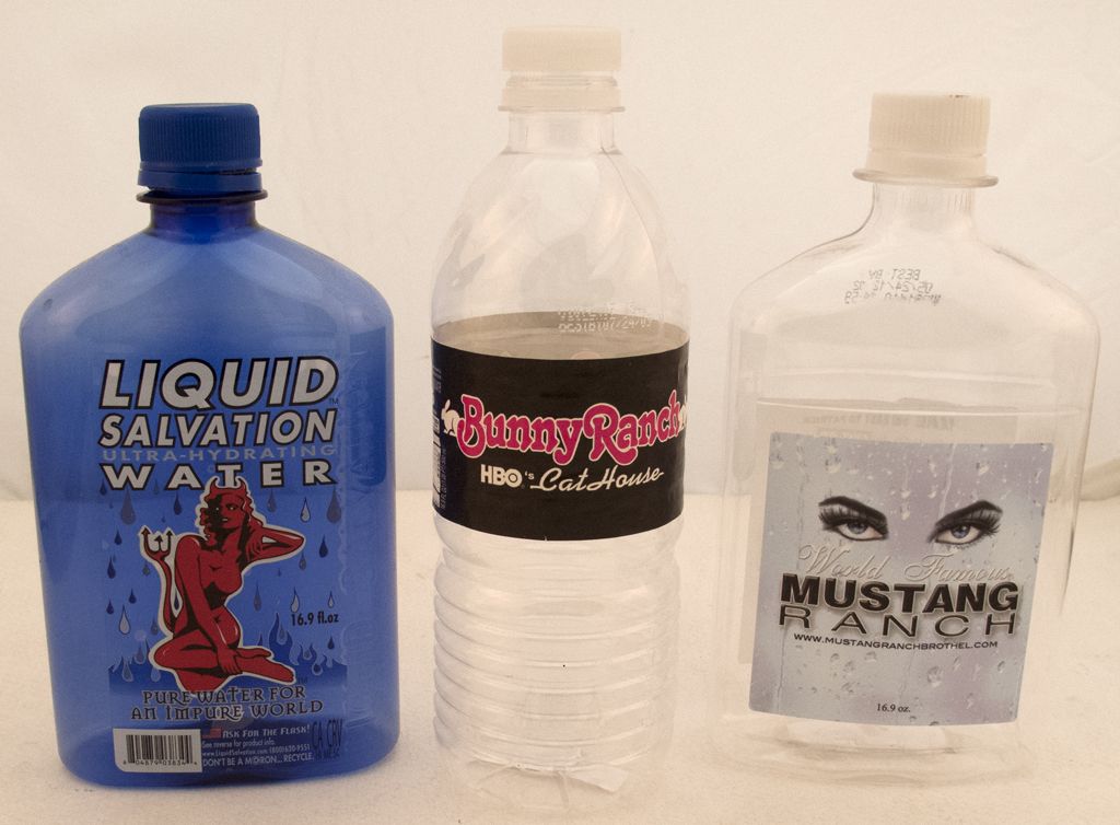 These were given to movie expert Robin Holabird while she was working on the movie 'Love Ranch.' 1) World Famous Mustang Ranch. Alluring eyes invite you in. 2) Bunny Ranch / HBO's Cat House. 3) Liquid Salvation Ultra-Hydrating Water / Pure water for an impure world. The devilish beautiful woman says it all!
