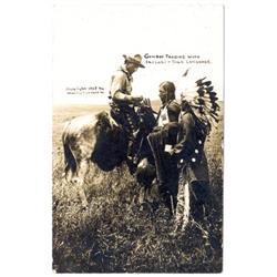 a) "Cowboy Trading with Indians - Sign Language." C. 1909. No cancellation but message: "Do you have many Indians in Mich.? Their [sic] are not so many wright [sic] here but south west of here is a large reservation." Dated March 17, 1911. [3+] b) "The Early West 1870 - Cowboy and Daughter." C. 1909. Unsent. Divided back, "AZO" box. [4] c) "Cowboys at Home" C. 1909. Cancelled 1909. [3+]