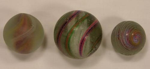 Three candy stripe swirl marbles (1 inch, 1 1/2 inch, 2 inch) fair condition.