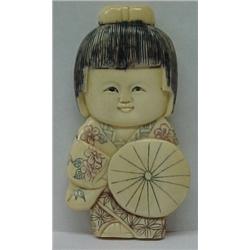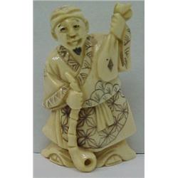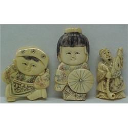 Three carved netsukes, 2" high man with pipe and bag and boy and girl 2" and 3" high, all three pieces signed