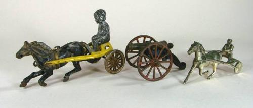 Three cast Iron toys including two horse and sulky's plus one cannon. Fair to Good Cond.