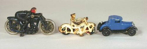 Three cast iron toys including two motorcycles and one automobile. Fair to Good Cond.