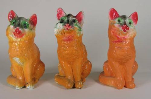 Three chalkware carnival cat figural prizes, 7 inches tall, all three in good condition.