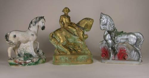 Three chalkware carnival figural prizes including George Washington on horse and two horse figures all in good condition, approx. 11 inches tall each.