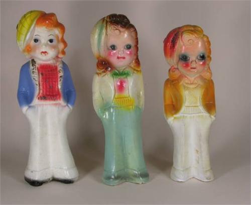 Three chalkware carnival prizes in girl figures wearing various dresses, approx. 15 inches tall, all in excellent condition.