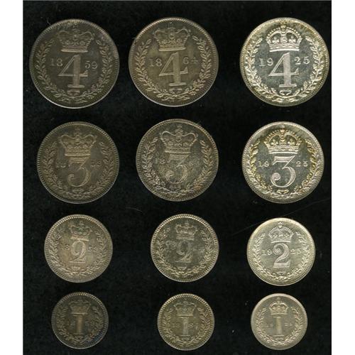 <B>Three choice Maundy sets, 1859 (2 sets) and 1925. </B></I>S-3916 and S-4027. Victoria young head and George V. Uncirculated, most of the coins flashy and very choice. Desirable pieces!