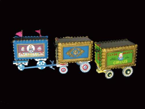 Three circus wagons including Clyde Beatty wagon, Stupendous wagon and Circus wagon handcrafted by local artist, 10 inches long. Excellent Condition.
