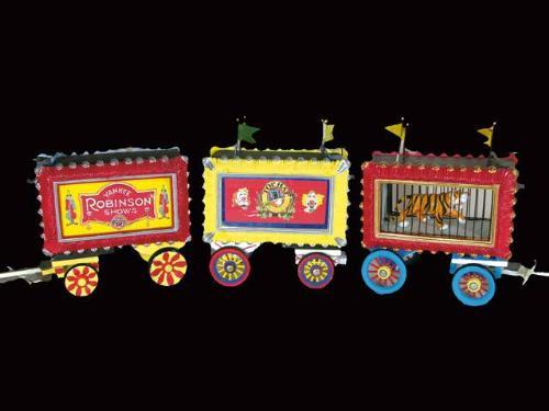 Three circus wagons including #8 Robinson Shows wagon, #9 Top Hat wagon and #7 Tiger Wagon handcrafted by local artist, 10 inches long. Excellent Condition.