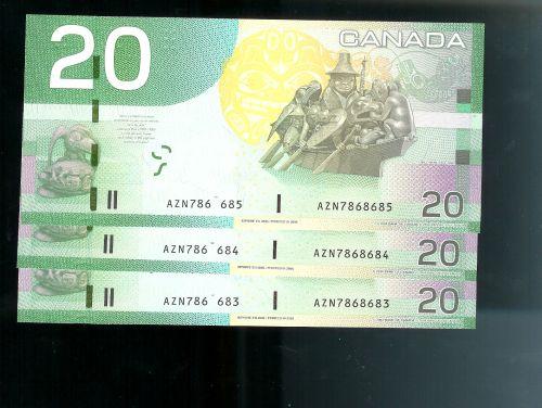 Three consecutive numbered notes with "Missing digit number 6" on the left hand side in each of the serial numbers. BC-64a $20 2004 AZN7868683-684-685. Scarce and unusual! All notes are Gem!