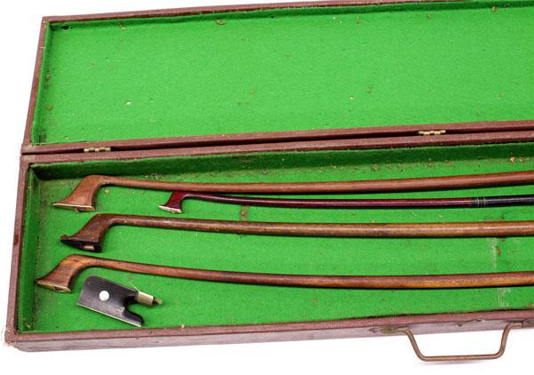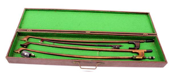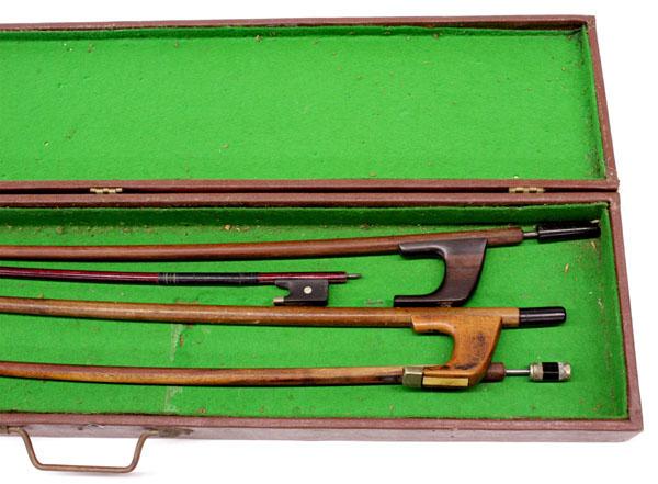 (lot of 4) Three continental viola bows, one English, made of beech, two German made of mahogany, each having rosewood or ebony frogs, one with a pearl eye, and a violin bow in need of restoration, Dave Lario's personal bows for his upright bass, largest 28''
