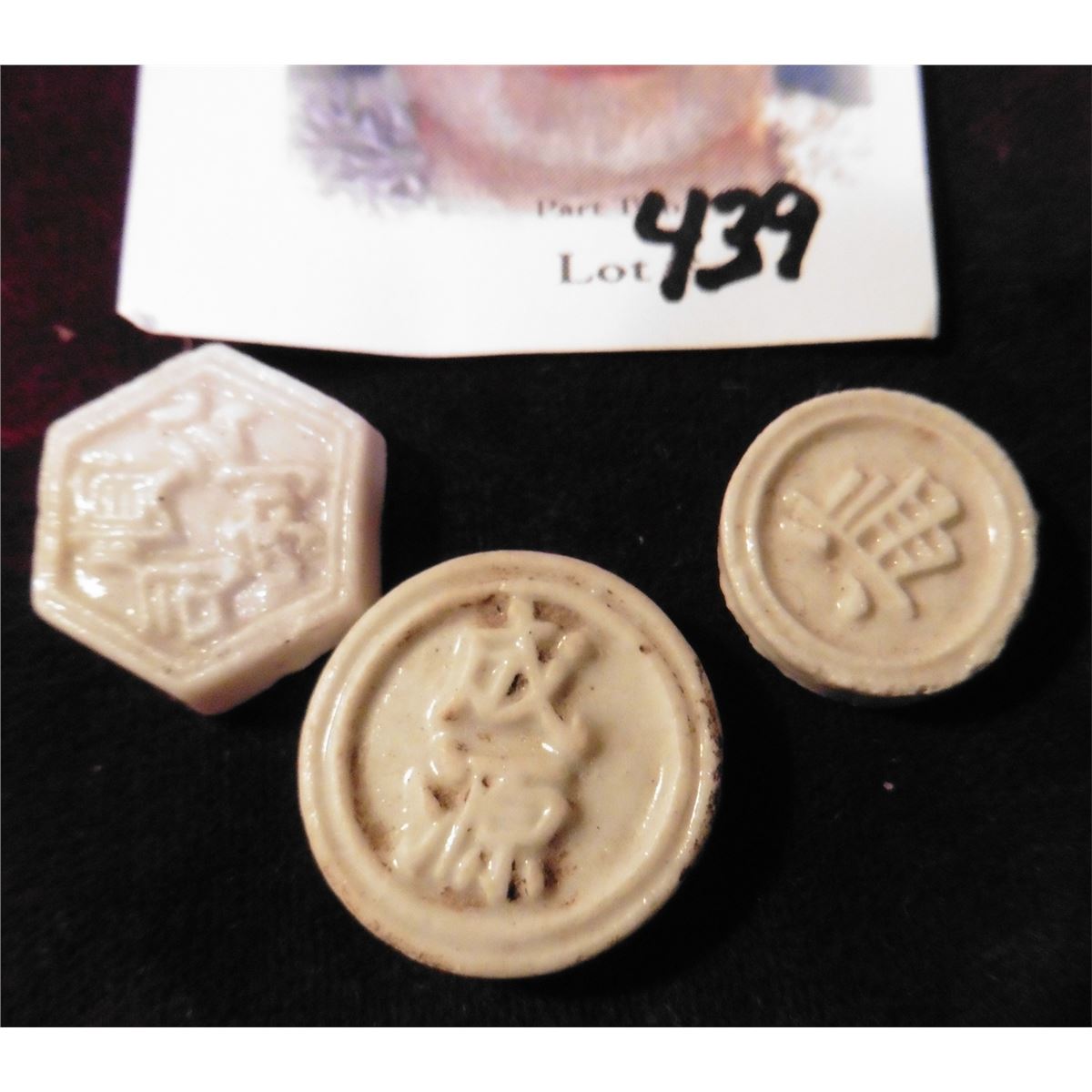 Three different Siamese Porcelain Gambling Tokens. All with high relief figures on one side and blue delft Chinese writing on the other. Ca. 1800's.