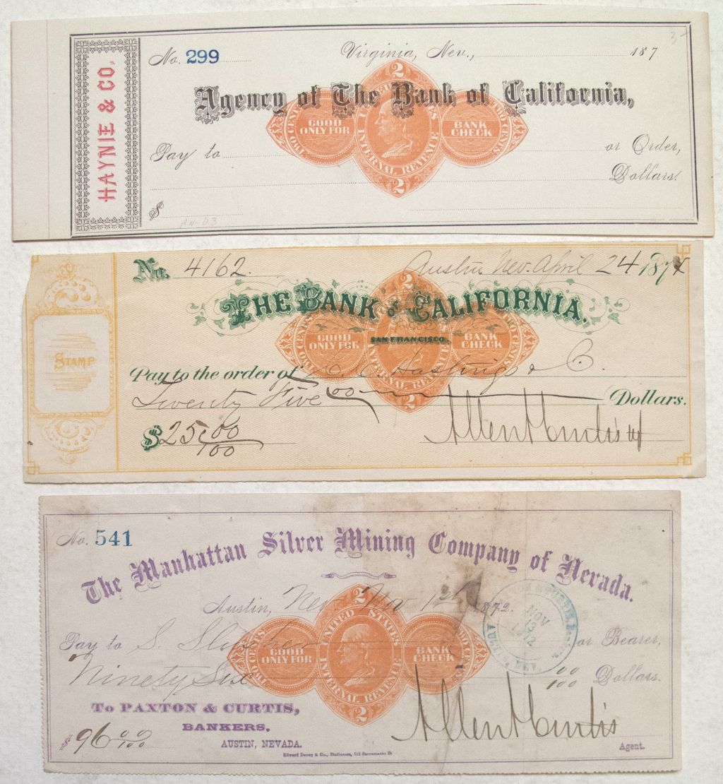 RND7's. 1) Bank of California, Austin, Nevada (unusual usage), 1874, signed by Allen Curtis. 2) Agency of the Bank of California. Unused. Haynie & Company. 3) Paxton & Curtis, Austin, 1872, Manhattan Silver Mining Company of Nevada.