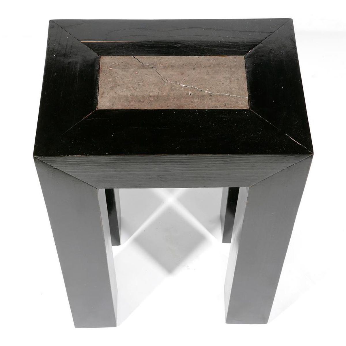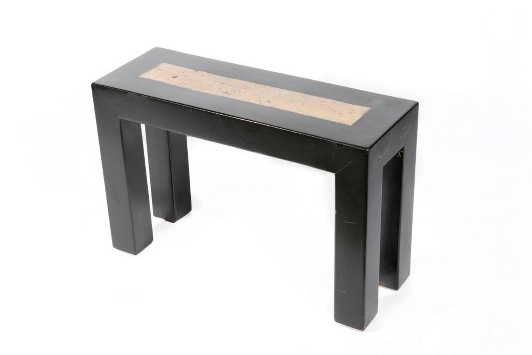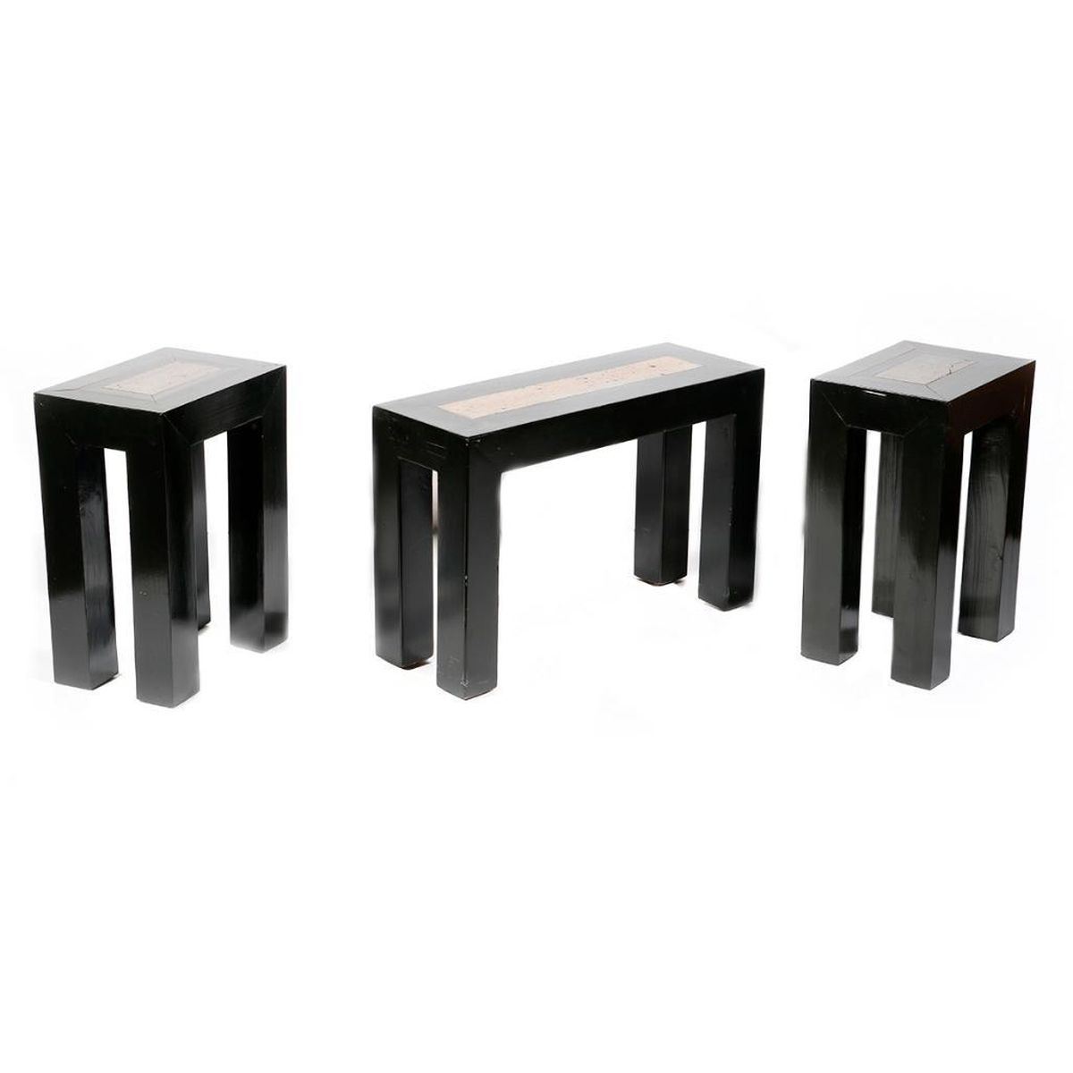 Three Asian ebonized and stone inset low tables, two measuring 20 inches high x 14 wide x 10 deep and one measuring 18 high x 28 wide x 10 deep. Some cracking to stone. Note: this item is heavy for shipping.