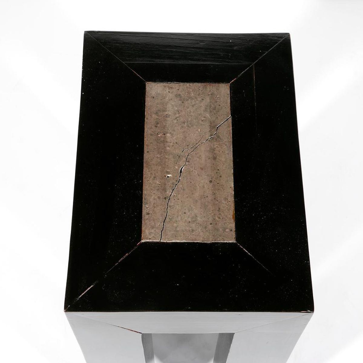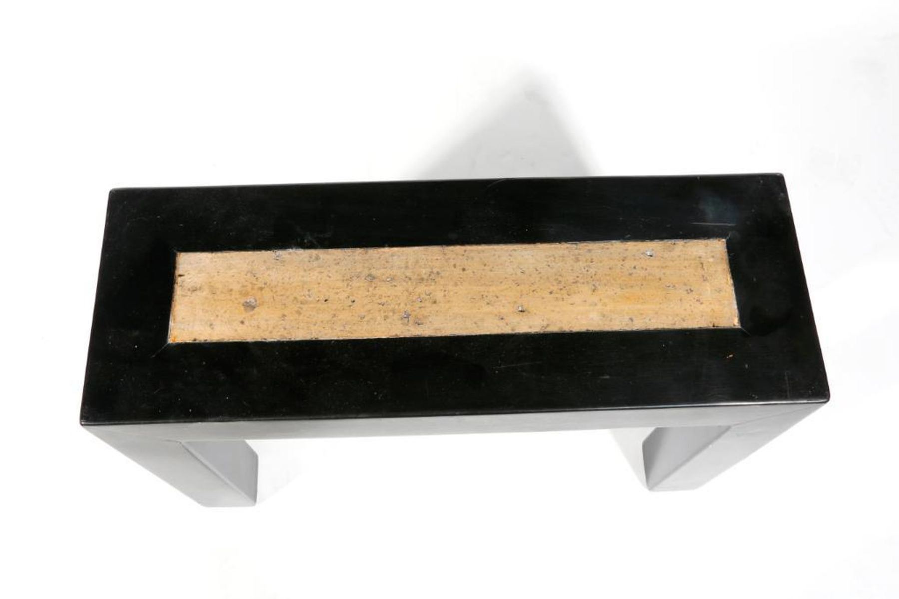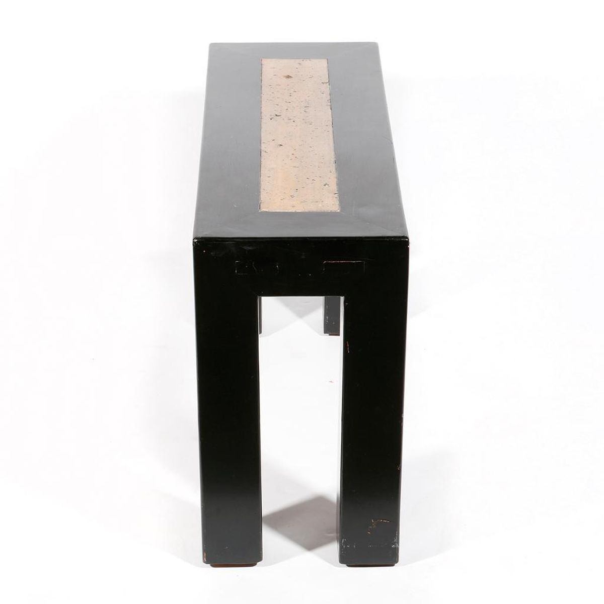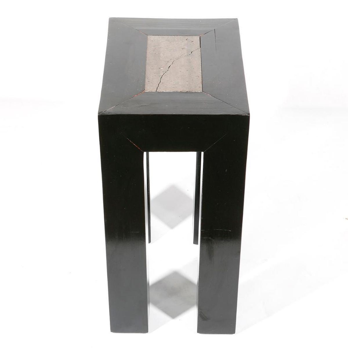 Three Asian ebonized and stone inset low tables, two measuring 20 inches high x 14 wide x 10 deep and one measuring 18 high x 28 wide x 10 deep. Some cracking to stone. Note: this item is heavy for shipping.