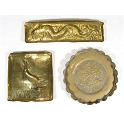 Three embossed brass Arts & Crafts style dishes, largest 25cm long